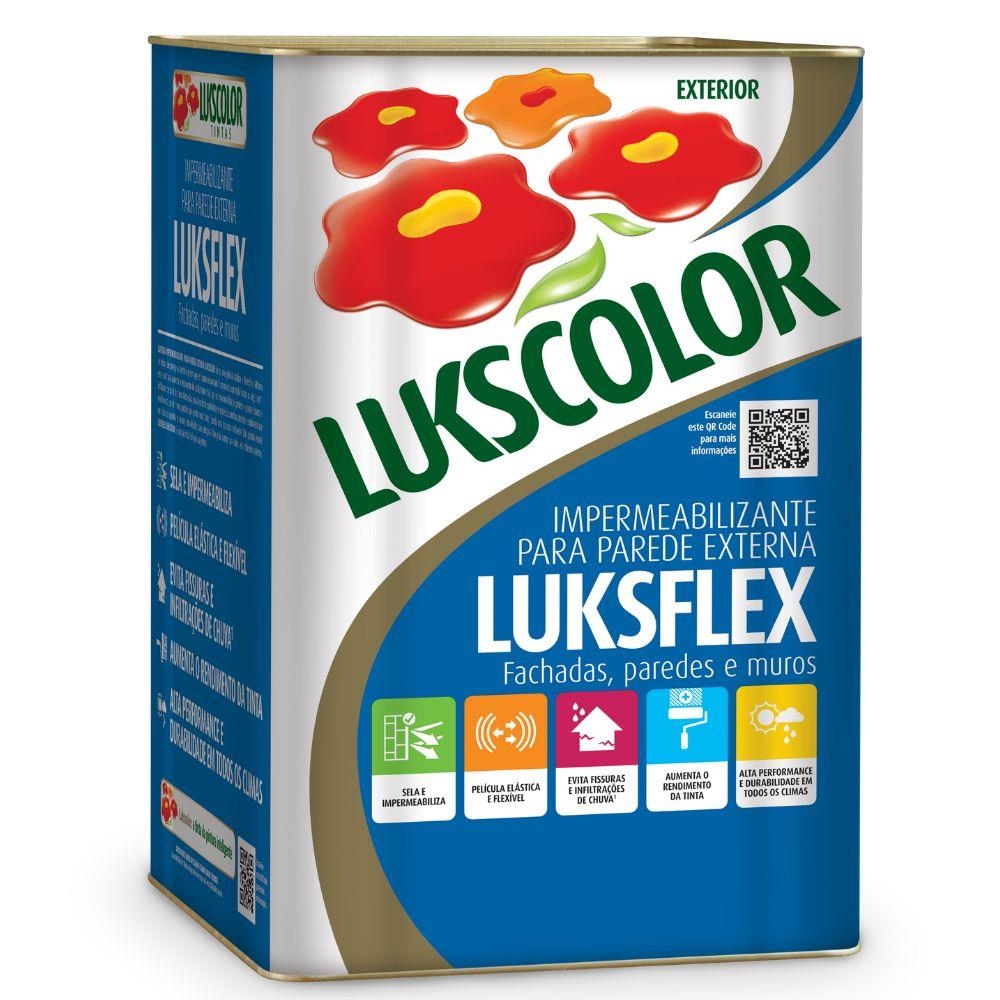 LUKSFLEX IMPERMEABILIZANTE PARA PAREDE EXTERNA LUKSCOLOR forma uma película elástica e flexível de altíssima tecnologia que protege as paredes e previne que as fissuras reapareçam.É um produto com tripla função, ou seja, 3 em 1: sela e com isso aumenta o rendimento do acabamento final, age na impermeabilização positiva e previne fissuras e infiltrações de batida de chuva.Além disso, possui excelente durabilidade e resistência, com boa cobertura e rendimento que resultam no uso de menos produto para pintar muito mais, fazendo uma economia inteligente.Este produto excede em todos os quesitos as normas estabelecidas para categoria. Para praia, campo ou cidade, em ambientes externos, LUKSFLEX LUKSCOLOR é a solução imbatível para sua pintura.
